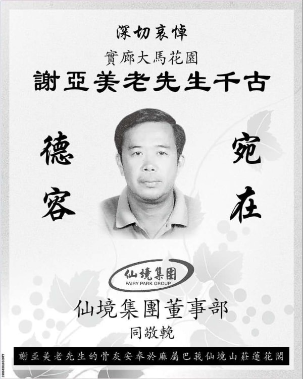 永远怀念 现择定于5月11日2020年(星期一)上午11时正出殡,由丧居移柩发引至麻坡巴莪仙境山庄风景墓园火化。 谨此敬告亲友们。 仙境殡葬服务:伟利殡仪服务 联络电话:013-2063151