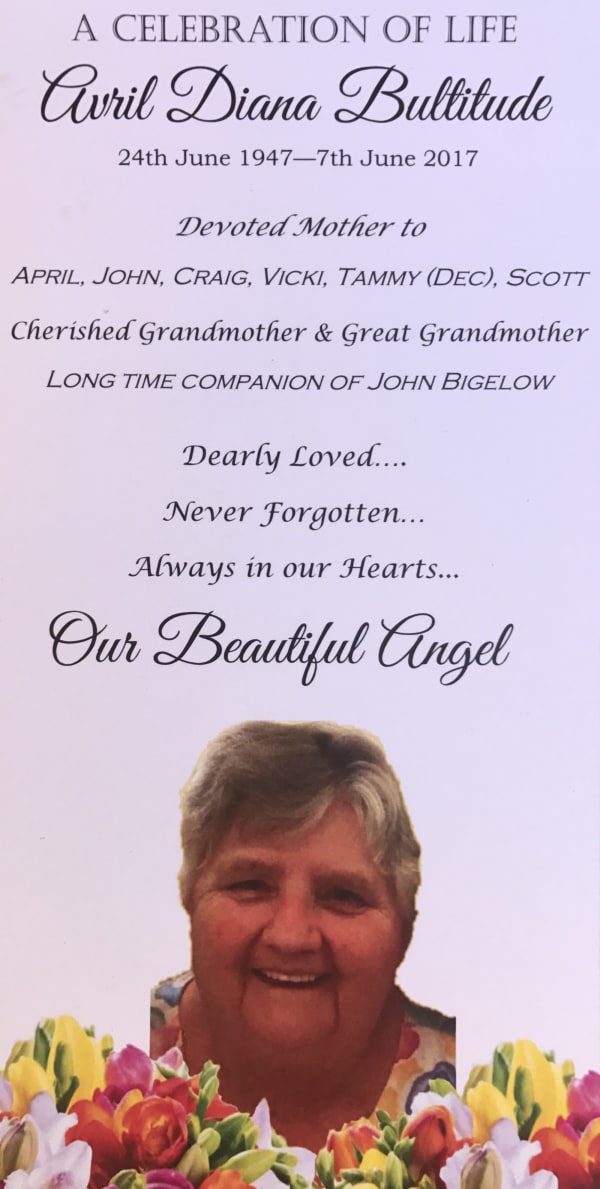 Mrs April Dianne McManus Love you Mum..I wish you were here..I miss our talks..I miss your kisses..I miss your cuddles..💚💚💚
