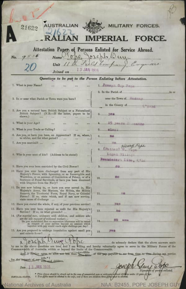 Australian War Stories ALL SIGNED UP Joseph Guy POPE signed-up to join the Australian Imperial Force (AIF) at the Brisbane QLD recruitment office. Joseph duly completed the AIF enlistment form – called the ‘Attestation Paper’. He confirmed his age, occupation and marital status and noted that his home was in Queensland. Joseph advised that his next of kin was ‘(Father) POPE Henry’. On the second page of the Attestation Paper he made the following oath in the presence of the Attesting Officer: “I, Joseph Guy POPE … swear that I will well and truly serve our Sovereign Lord the King in the Australian Imperial Force until the end of the War … SO HELP ME, GOD.” Joseph was assigned the AIF service number 9536 that would appear on his active service and medical records. 📄 First page of Attestation Paper, © Commonwealth of Australia (National Archives of Australia) 2019. 📷 Volunteers with their Attestation Papers waiting to enlist outside Victoria Barracks recruitment office in Sydney (Courtesy: Australian War Memorial, A03406)