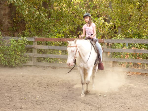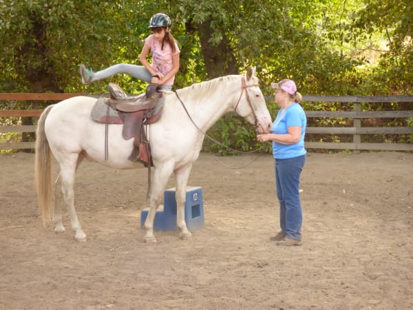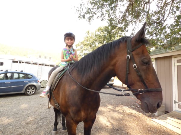 Julie Talcott-Fuller Getting ready for a trail ride in Ashland. Ruby got to ride Reno and that's Tabitha up on Zeppelin. Granny is leading Tiger (?--I think) and Auntie Julie took the pics. A fun day.