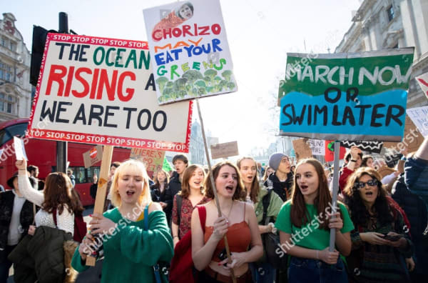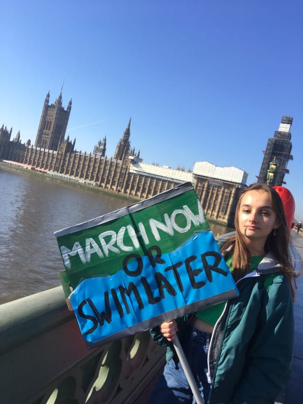 Jessie Rosenbaum ‘March now or swim later’ on Westminster Bridge, on our way to a Fridays for Future march ❤️