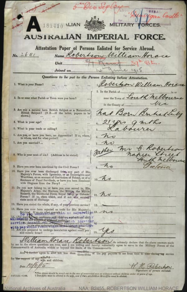 Australian War Stories ALL SIGNED UP William Horace ROBERTSON signed-up to join the Australian Imperial Force (AIF) at the Melbourne VIC recruitment office. William duly completed the AIF enlistment form – called the ‘Attestation Paper’. He confirmed his age, occupation and marital status and noted that his home was in Victoria. William advised that his next of kin was ‘(Father) ROBERTSON C’. On the second page of the Attestation Paper he made the following oath in the presence of the Attesting Officer: “I, William Horace ROBERTSON … swear that I will well and truly serve our Sovereign Lord the King in the Australian Imperial Force until the end of the War … SO HELP ME, GOD.” William was assigned the AIF service number 2651 that would appear on his active service and medical records. 📄 First page of Attestation Paper, © Commonwealth of Australia (National Archives of Australia) 2019. 📷 Volunteers with their Attestation Papers waiting to enlist outside Victoria Barracks recruitment office in Sydney (Courtesy: Australian War Memorial, A03406)